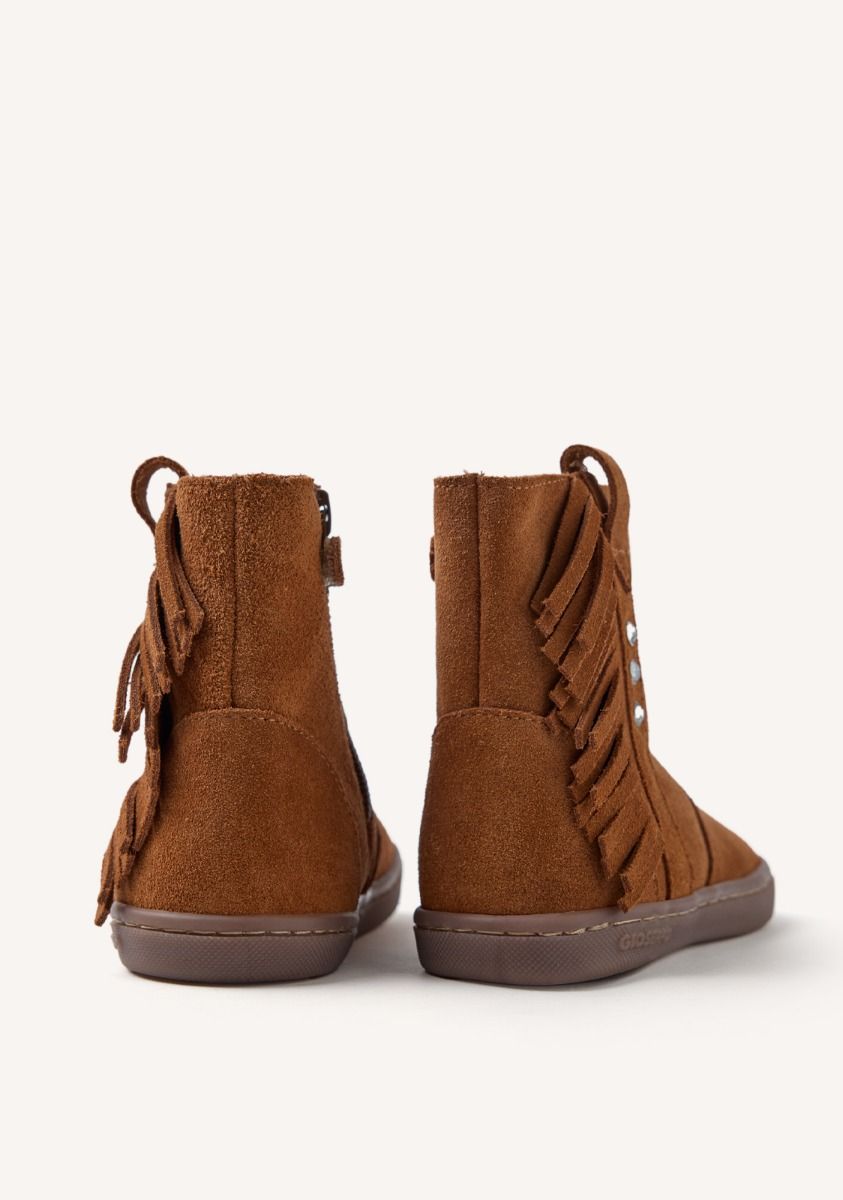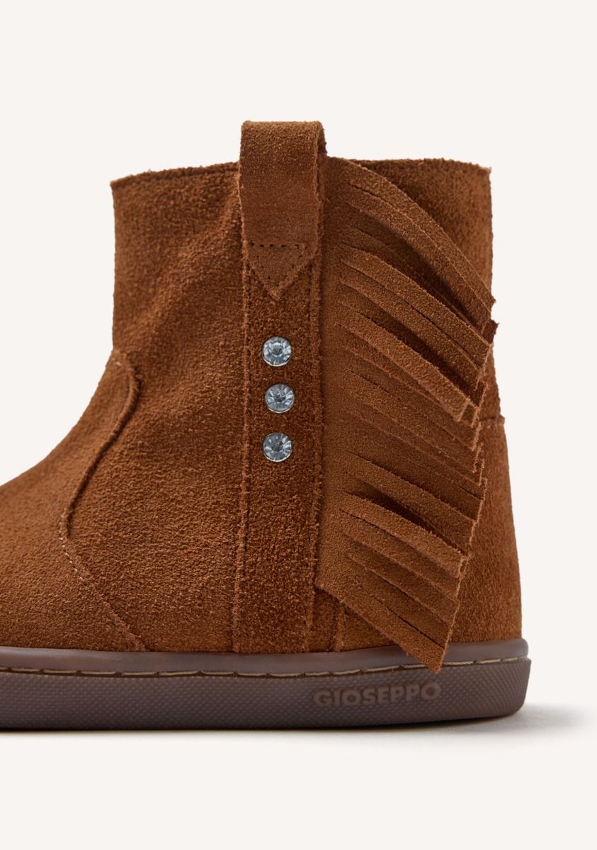 Botas de piel serraje con flecos y pedrería. Cuentan con cremallera en el lateral interno de la caña. Diseñadas siguiendo las tendencias minimalistas para garantizar la pisada natural.