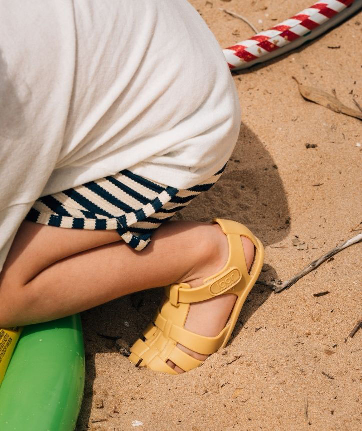 Cangrejera diseñada en concepto barefoot medium, cero drop, flexible y blandita, fabricada con al menos un 50% de pvc reciclado libre de ftalatos y cierre adherente.