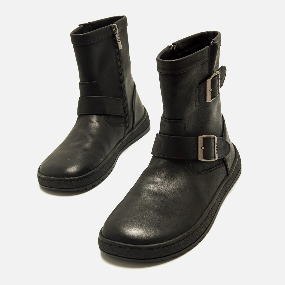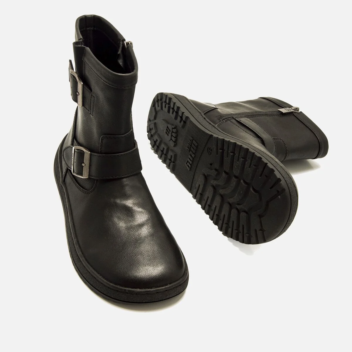Botines biker de color negro para mujer, modelo Free Alask de Mustang. Este diseño de caña media combina una silueta robusta con detalles funcionales como cierre lateral con cremallera y dos hebillas metálicas en el lateral. Diseñadas y desarrolladas especialmente en colaboración con el Dr. Juanjo López, traumatólogo deportivo, para respetar el desarrollo natural del pie. Se trata de un calzado minimalista que gracias a su puntera ancha, suela totalmente plana (cero drop) y flexibilidad, mejora la anatomía del pie y favorece una mejor posición del mismo. Con certificado VEGANO sellado por INESCOP, el cual garantiza que la naturaleza química principal del material no se corresponde con fibras de origen animal.