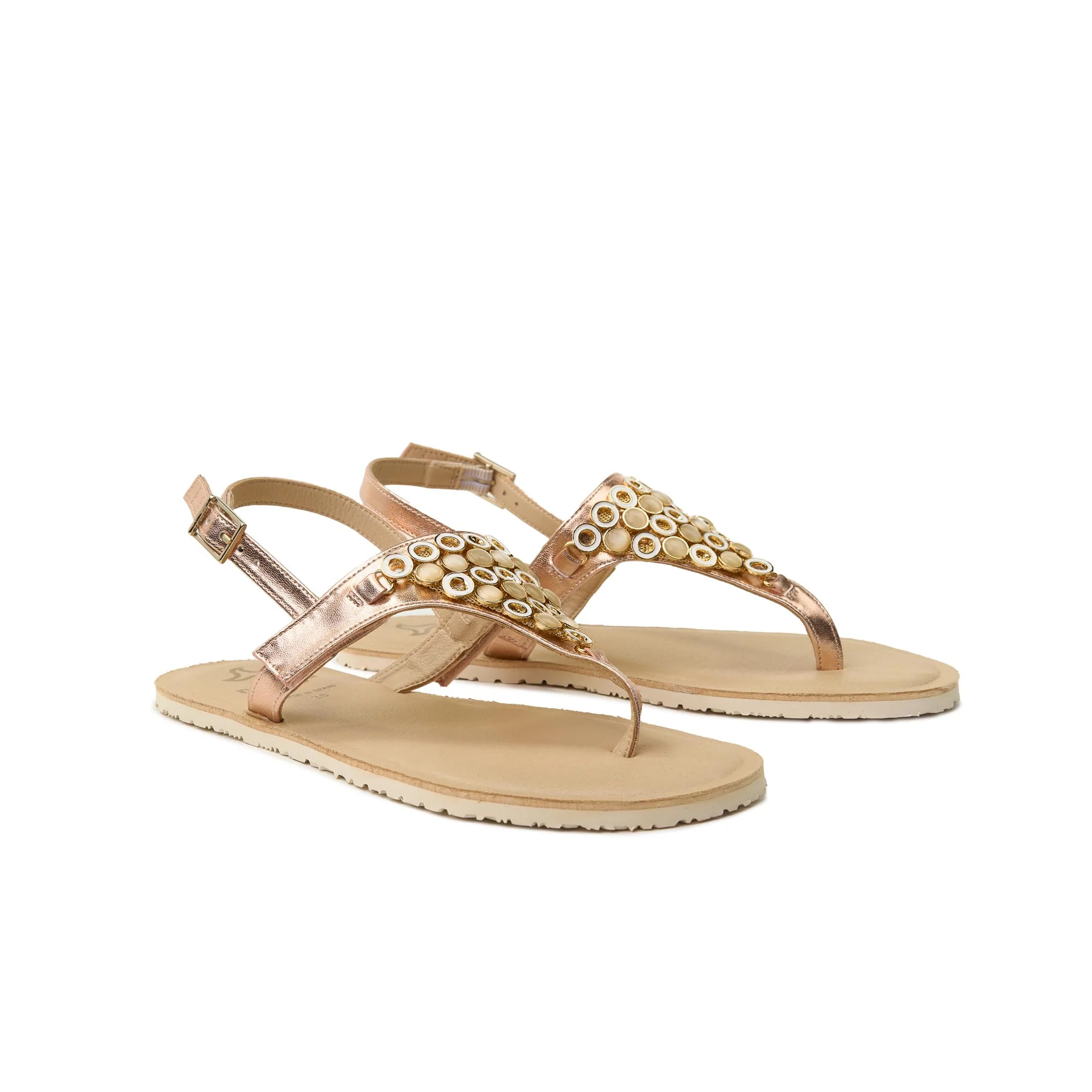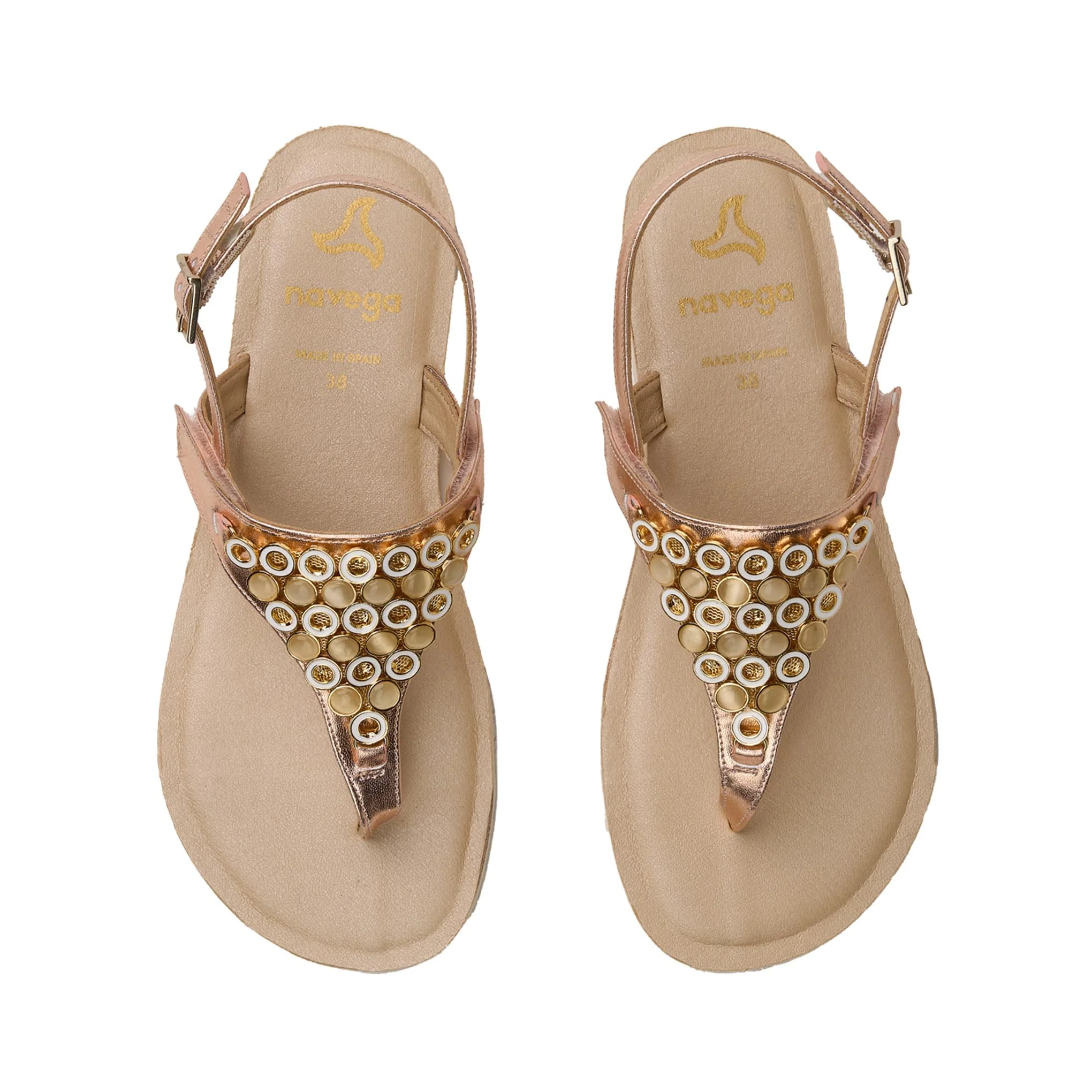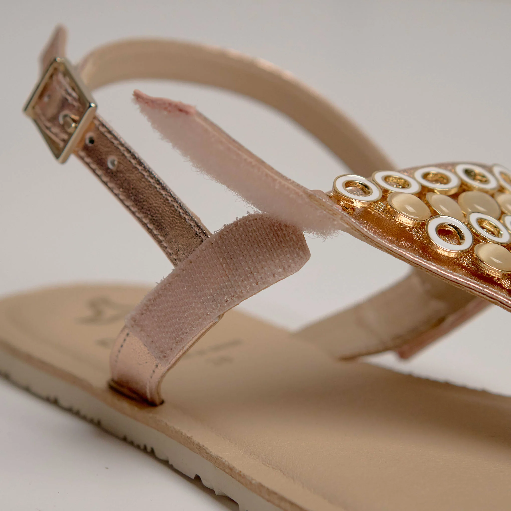 Sandalia en color rosa oro con detalle de piedrecitas en el empeine.