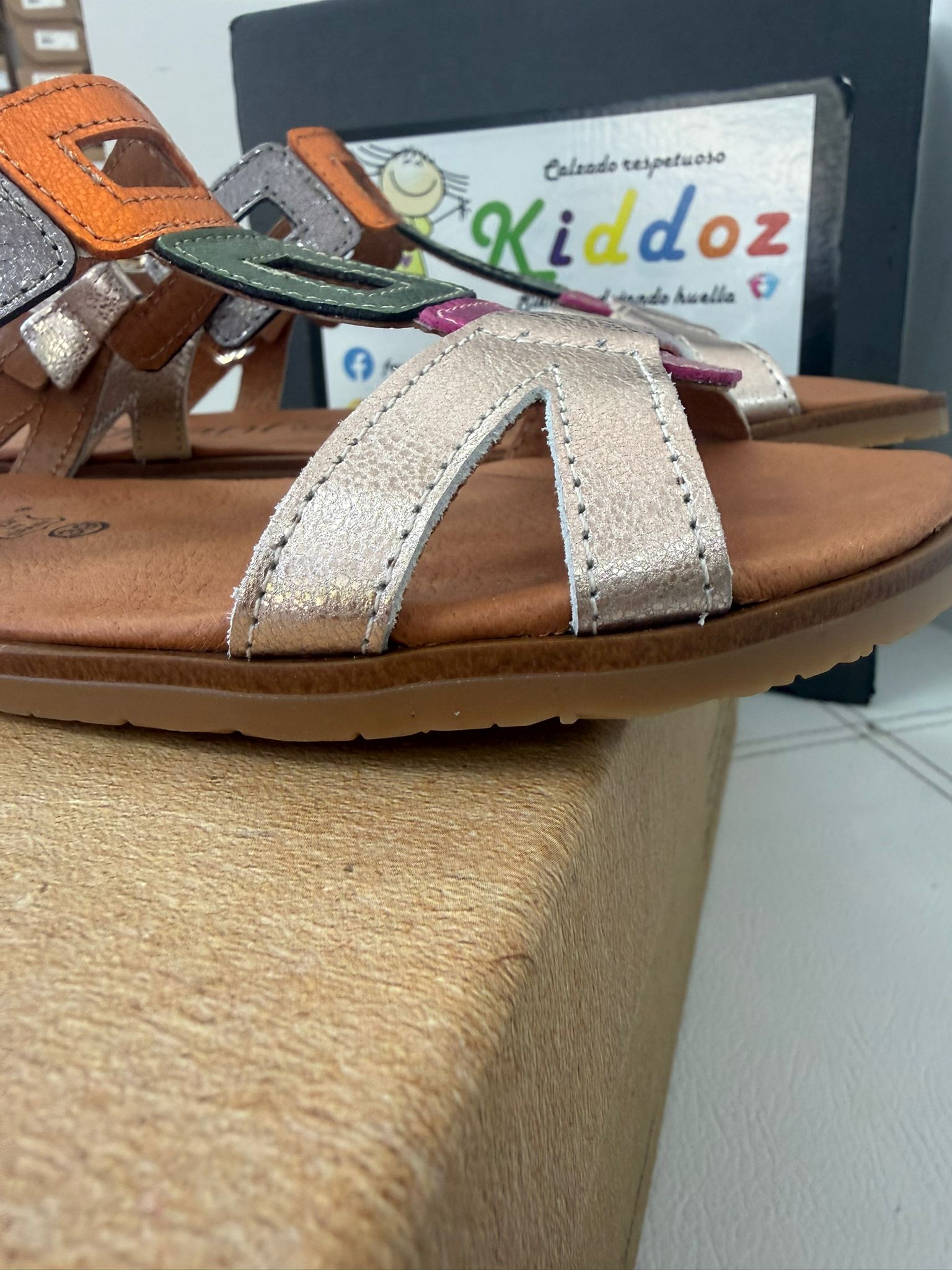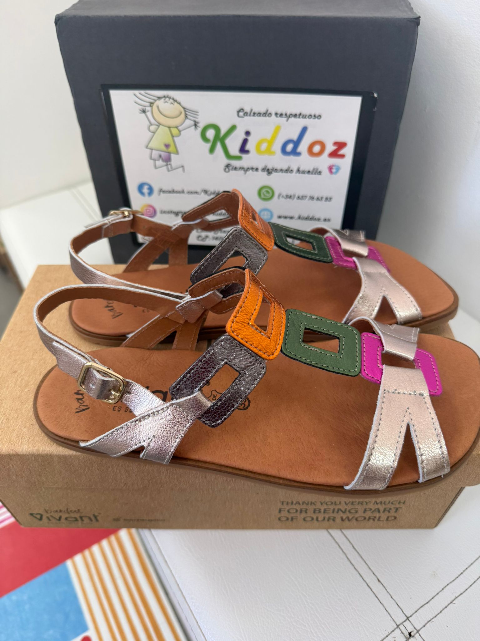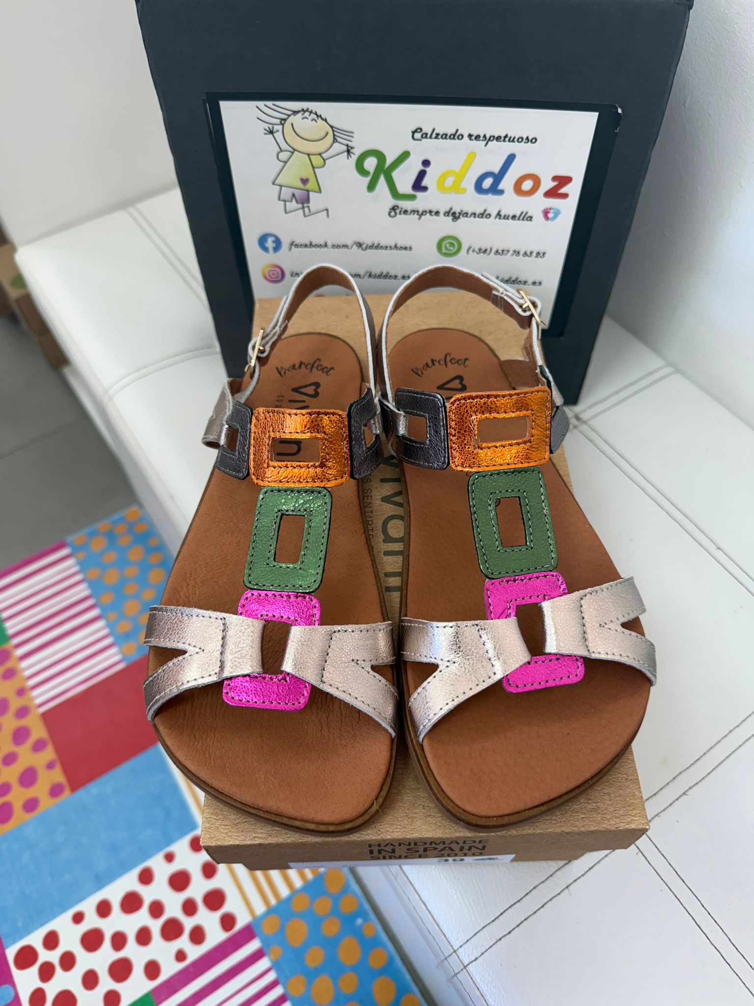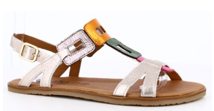 Fabricada artesanalmente en España, en piel color plateado con detalles en dorado, fucsia y verde en la pala combina elegancia y confort. Su suela plana, flexible y sin drop, típica del calzado respetuoso, favorece una pisada más natural, ligera y alineada con tu cuerpo, pero perfecta para hacer transición con sus 12mm de grosor.